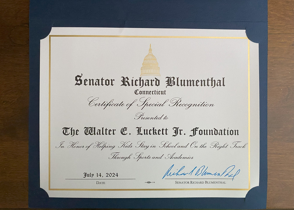 CONNECTICUT July 14, 2024 - Senator Richard Blumenthal paid a visit to Walter & Valita to present a Certificate of Special Recognition Award for 'helping kids stay in school and on the right track through sports and academics'. Walter was delighted and honored to receive this recognition. Walter’s goal is to train the youth in Bridgeport, New Haven, Norwalk, and Waterbury to prepare them for the corporate and working world.